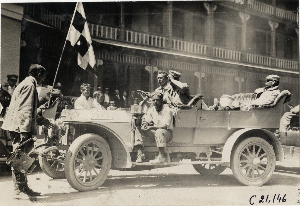 View of motorists in Garford car no. 30 in front of the Bedford Springs Hotel at Bedford, Pennsylvania during the 1908 Glidden Tour. Official stands in front of car; checkered flag on left. Handwritten on back: "Tours--Glidden Tour, 1908."