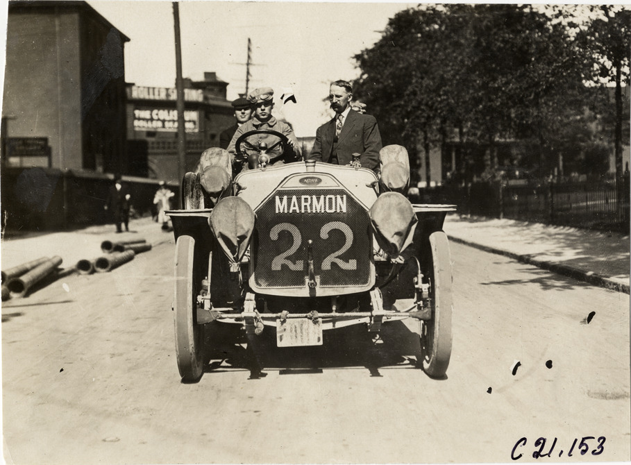 Motorists in Marmon automobile at Buffalo, New York, 1908 Glidden Tour