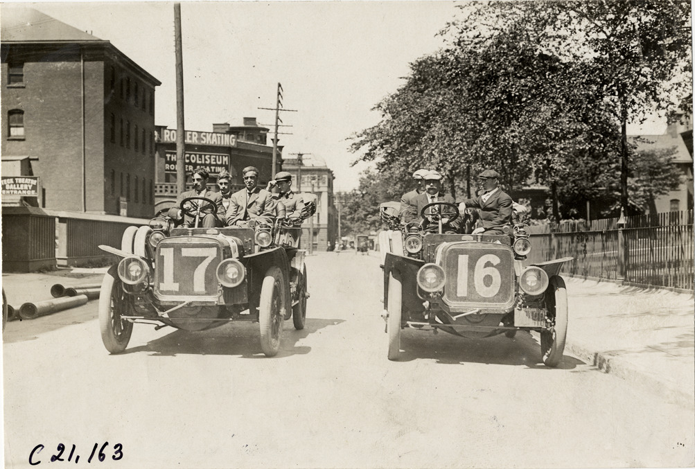 View of motorists posing in Stevens-Duryea cars no. 16 and no. 17 at Buffalo, New York during the 1908 Glidden Tour. Coliseum roller skating rink in background. Handwritten on back: "Tours--Glidden Tour, 1908."