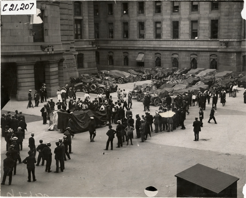 Crowd with automobiles in courtyard, 1908 Glidden Tour