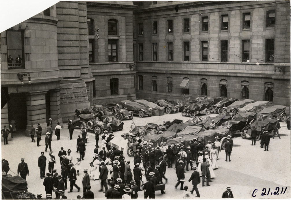 Crowd with automobiles in courtyard, 1908 Glidden Tour