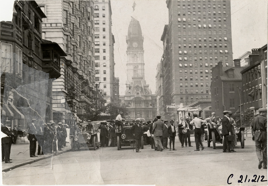 View of spectators surrounding cars in street at Philadelphia, Pennsylvania during the 1908 Glidden Tour. City hall in background. Handwritten on back: "Tours--Glidden Tour, 1908."