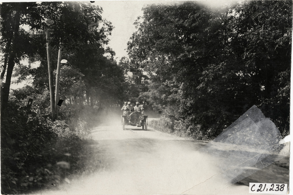 Motorists in automobile traveling on rural road, 1908 Glidden Tour
