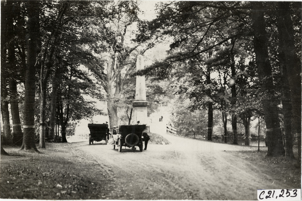 Rear view of two cars parked in front of monument or obelisk during the 1908 Glidden Tour. Handwritten on back: "Tours--Glidden Tour, 1908."