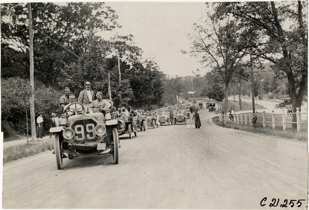 View of motorists in Pierce Great Arrow chairman's car no. 99, followed by other cars, during the 1908 Glidden Tour. Handwritten on back: "Tours--Glidden Tour, 1908."