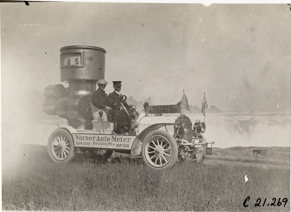 View of driver and passenger in the Warner Auto-Meter car during the 1908 Glidden Tour. Car body is shaped like an Auto-Meter; signs displayed on car read: "Warner Auto-Meter" and "Warner Auto-Meter, Beloit, Wis., how fast, how far." Handwritten on back: "Tours--Glidden Tour, 1908."
