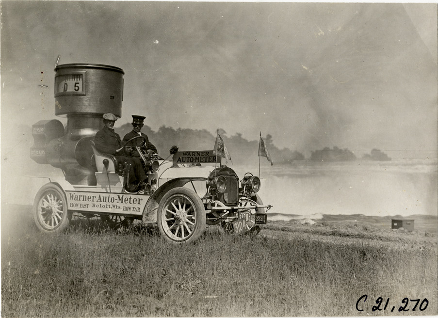 View of driver and passenger in the Warner Auto-Meter car during the 1908 Glidden Tour. Car body is shaped like an Auto-Meter; signs displayed on car read: "Warner Auto-Meter" and "Warner Auto-Meter, Beloit, Wis., how fast, how far." Handwritten on back: "Tours--Glidden Tour, 1908."