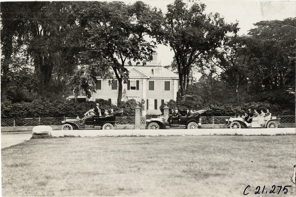 Distant view of motorists in three cars parked in front of two-story Colonial revival style house during the 1908 Glidden Tour. Handwritten on back: "Tours--Glidden Tour, 1908."