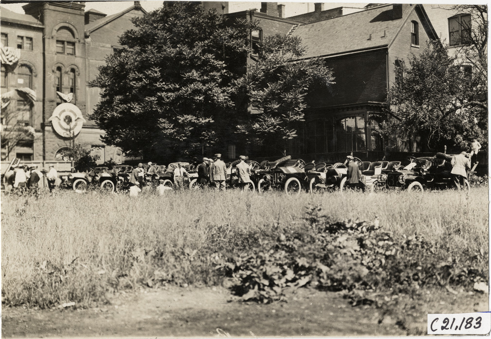 Distant view of motorists with cars in field at Buffalo, New York during the 1908 Glidden Tour. Brick building, partially obscured by trees, in background. Handwritten on back: "Tours--Glidden Tour, 1908."