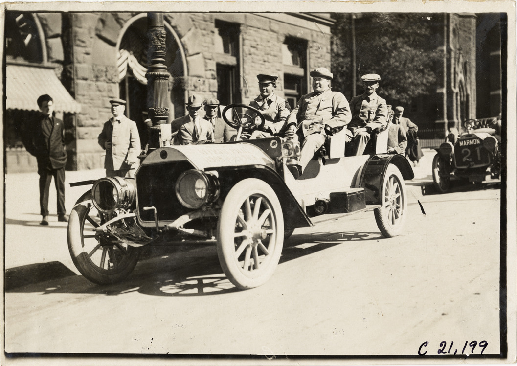 View of Dai H. Lewis and motorists in official pilot car at Buffalo, New York during the 1908 Glidden Tour. Marmon car no. 21 in background. Handwritten on back: "Tours--Glidden Tour, 1908."