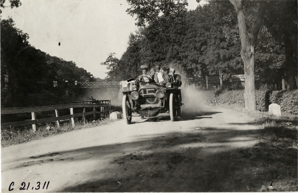 Joan Cuneo and passengers in Rainier automobile at Bedford, Pennsylvania, 1908 Glidden Tour