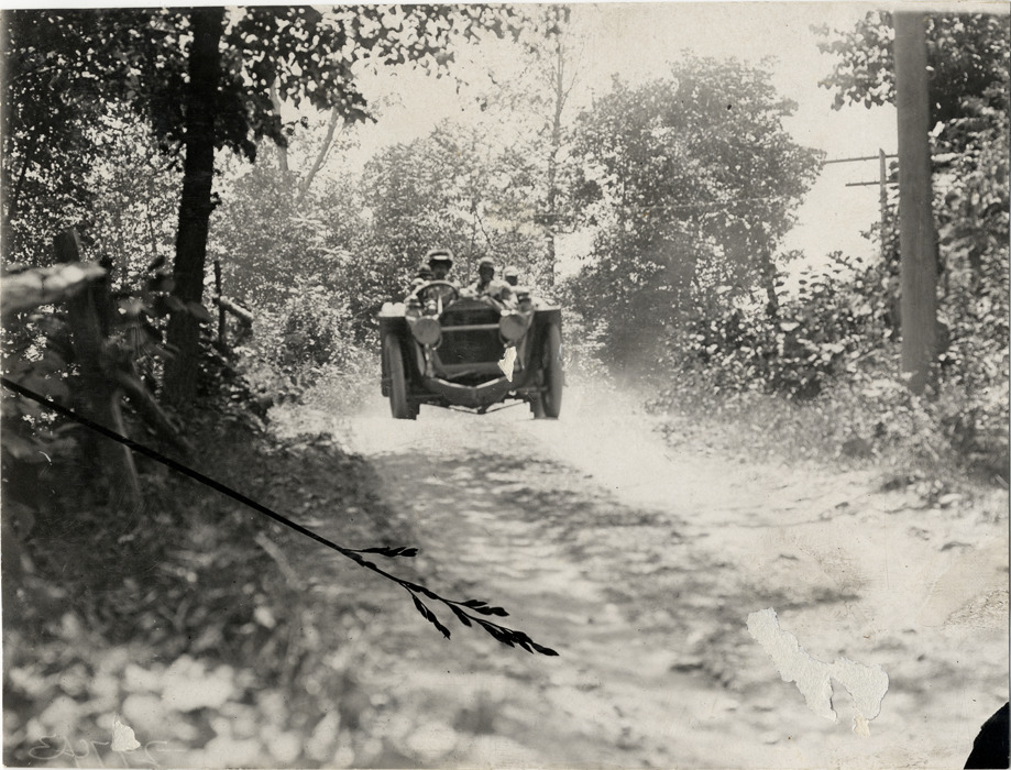 View of Joan Cuneo and passengers in Rainier car no. 15 traveling on rural dirt road during the 1908 Glidden Tour. Handwritten on back: "Tours--Glidden Tour, 1908."