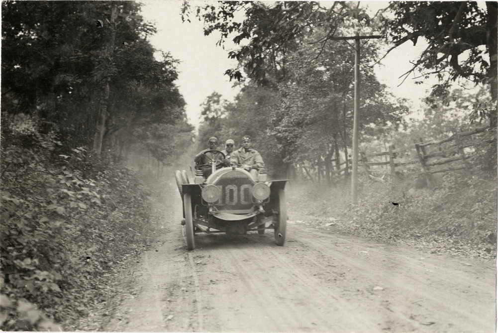 View of motorists in Pierce Great Arrow car no. 100 traveling on rural dirt road during the 1908 Glidden Tour. Handwritten on back: "Tours--Glidden Tour, 1908."