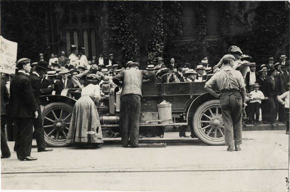 Favorite this☆ Motorists checking automobile, 1908 Glidden Tour Description: View of motorists checking car during the 1908 Glidden Tour. Spectators stand in front of ivy-covered building in background. Handwritten on back: "Tours--Glidden Tour, 1908." Details Resource ID: na023946 Subject: Automobiles Spectators Glidden Tour (1908) Automobile driving--Competitions--United States Photographic prints Date Issued: 1908-07 Format: 1 photographic print ; 4.5 x 6.75 in. Member of: National Automotive History Collection Lazarnick Collection Filing Location: Tours--Glidden Tour, 1908 #36 Rights: Physical rights are retained by DPL. Copyright is retained in accordance with U.S. copyright laws.
