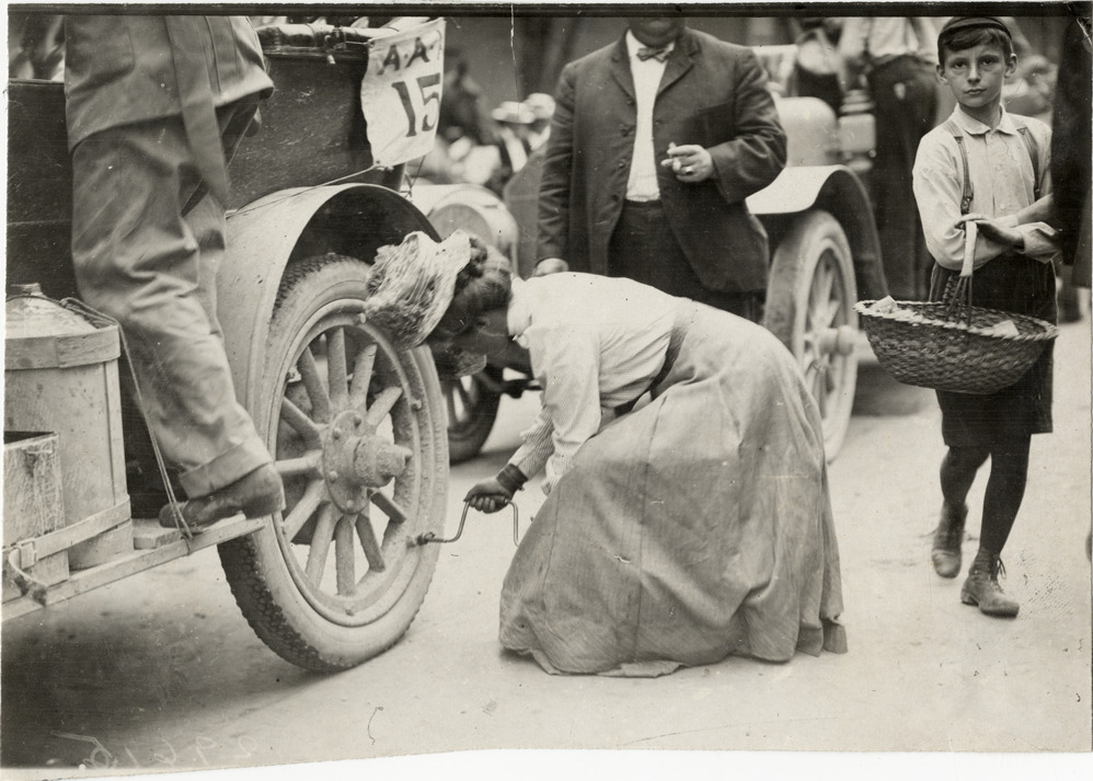 View of Joan Cuneo fixing tire on Rainier car no. 15 during the 1908 Glidden Tour. Boy holding basket stands on right. Handwritten on back: "Joan Cuneo. Tours--Glidden Tour, 1908."