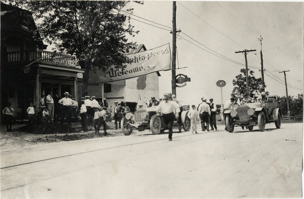 Favorite this☆ Automobiles parked near banner, 1908 Glidden Tour Description: View of two cars parked near "Philadelphia press, welcome" banner during the 1908 Glidden Tour. Spectators gather on porch of house. Handwritten on back: "Tours--Glidden Tour, 1908." Details Resource ID: na023976 Subject: Banners Automobiles Glidden Tour (1908) Automobile driving--Competitions--United States Photographic prints Date Issued: 1908-07 Format: 1 photographic print ; 4.5 x 6.75 in. Member of: National Automotive History Collection Lazarnick Collection Filing Location: Tours--Glidden Tour, 1908 #37 Rights: Physical rights are retained by DPL. Copyright is retained in accordance with U.S. copyright laws.