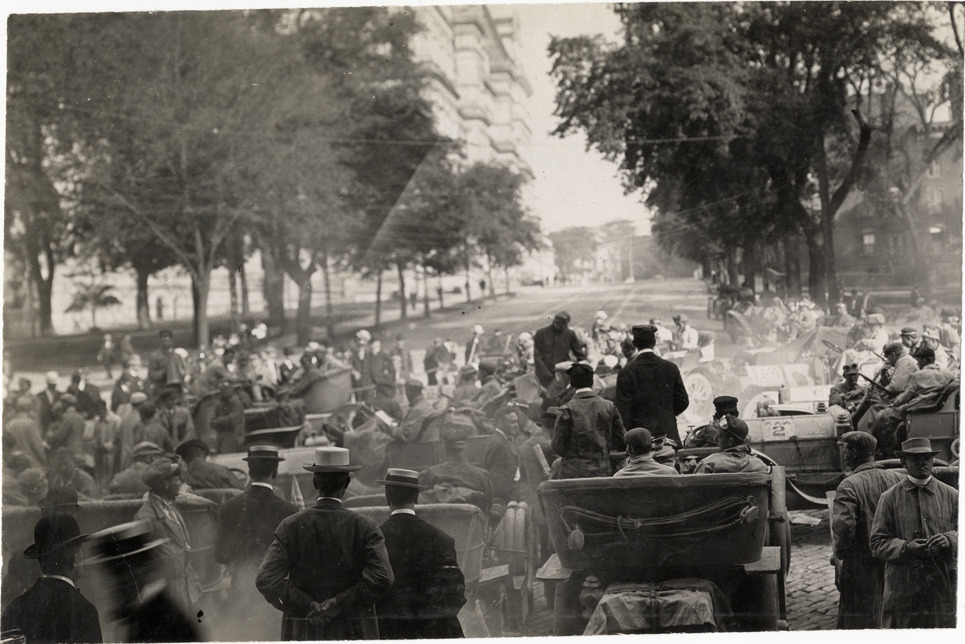 View of motorists with cars in street during the 1908 Glidden Tour. Handwritten on back: "Tours--Glidden Tour, 1908."