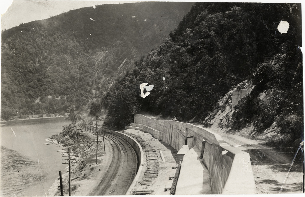 Distant view of motorists in car traveling on mountain road at Delaware Water Gap during the 1908 Glidden Tour. Wall separates road from railroad tracks. Handwritten on back: "Tours--Glidden Tour, 1908."