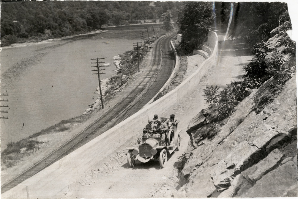 Bird's-eye view of motorists in Premier car no. 8 traveling on mountain road at Delaware Water Gap during the 1908 Glidden Tour. Wall separates road from railroad tracks. Handwritten on back: "Tours--Glidden Tour, 1908."