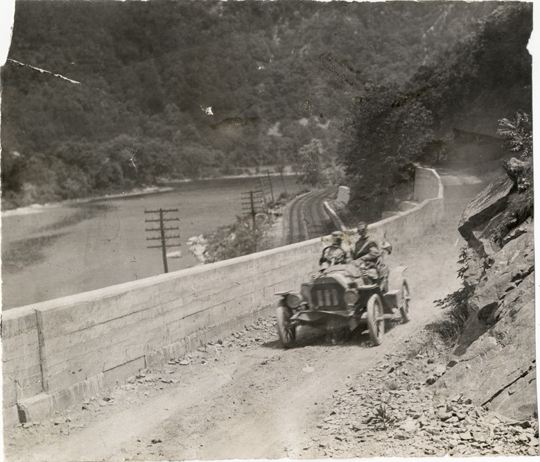 View of motorists in Overland car no. 111 traveling on mountain road adjacent to river during the 1908 Glidden Tour. Wall separates road from railroad tracks. Handwritten on back: "Tours--Glidden Tour, 1908."