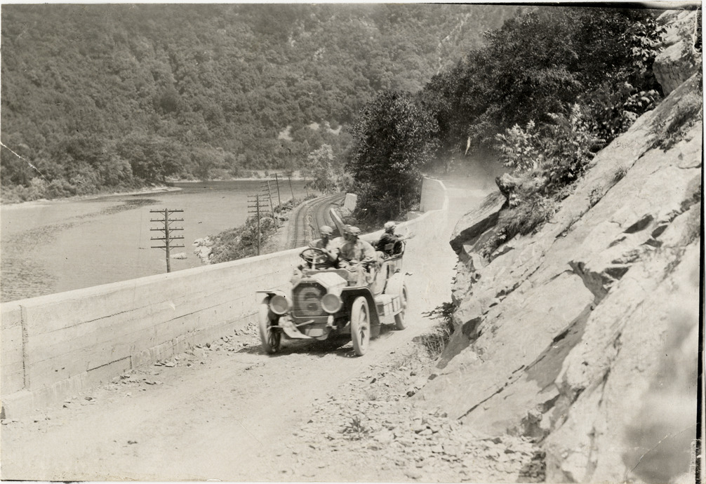 View of motorists in Peerless car no. 6 traveling on mountain road at Delaware Water Gap during the 1908 Glidden Tour. Wall separates road from railroad tracks. Handwritten on back: "Tours--Glidden Tour, 1908."
