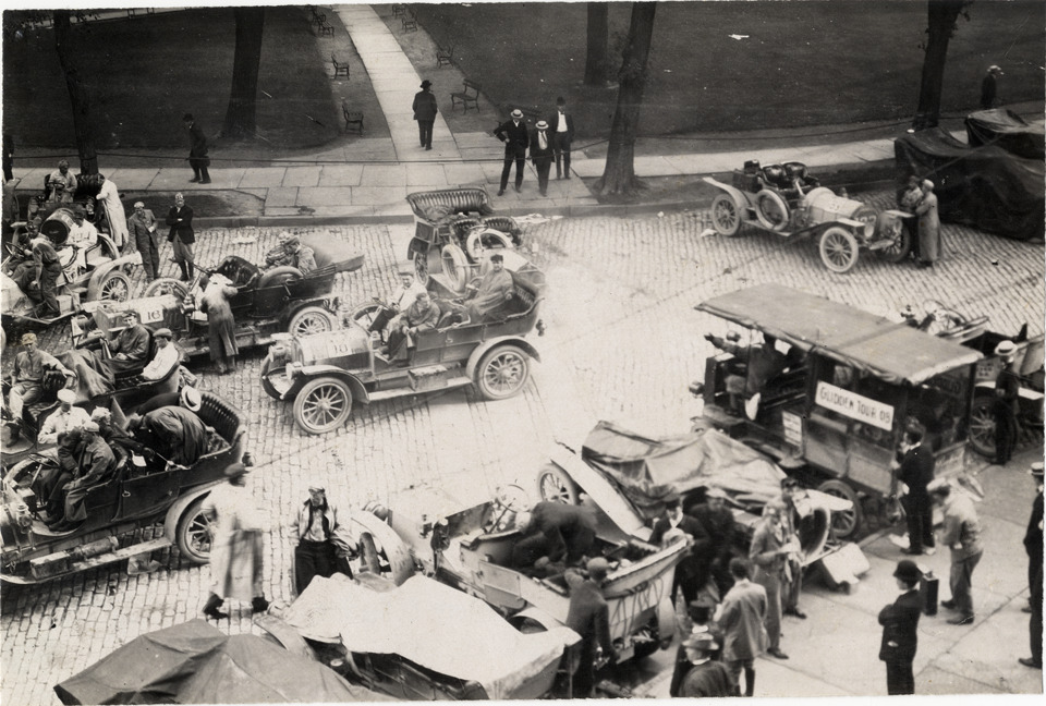 Favorite this☆ Motorists with automobiles, 1908 Glidden Tour Description: Bird's-eye view of motorists with cars in street during the 1908 Glidden Tour. Rapid truck on right. Handwritten on back: "Tours--Glidden Tour, 1908." Details Resource ID: na023990 Subject: Automobiles Trucks Glidden Tour (1908) Automobile driving--Competitions--United States Photographic prints Date Issued: 1908-07 Format: 1 photographic print ; 4.25 x 6.5 in. Member of: National Automotive History Collection Lazarnick Collection Filing Location: Tours--Glidden Tour, 1908 #38 Rights: Physical rights are retained by DPL. Copyright is retained in accordance with U.S. copyright laws.