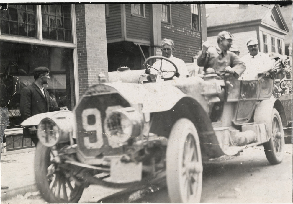 View of motorists in Pierce Great Arrow chairman's car no. 99 during the 1908 Glidden Tour. Charles Glidden rides in rear passenger seat. Handwritten on back: "Tours--Glidden Tour, 1908."