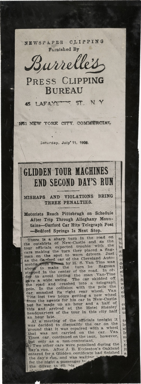 View of fragment of newspaper clipping, dated July 11, 1908, regarding the 1908 Glidden Tour. Title reads: "Glidden Tour machines end second day's run." Clipping was provided by Burrelle's Press Clipping Bureau, located at 45 Lafayette St., New York. Handwritten on back: "Tours--Glidden Tour, 1908."