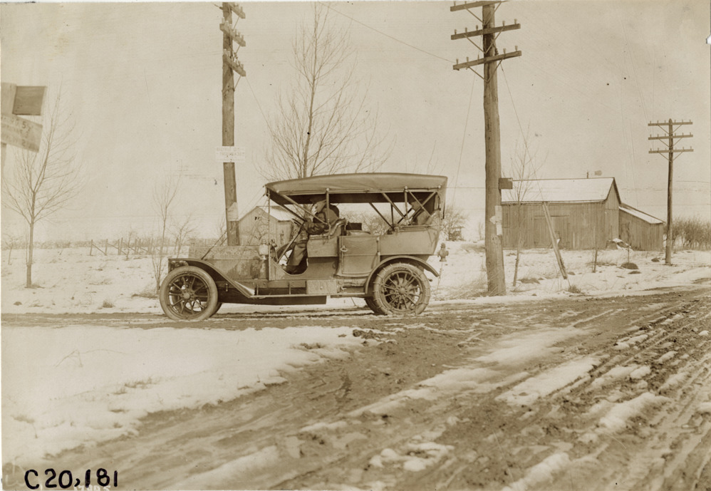 View of motorists in Premier car traveling on snow-covered rural dirt road in New York during the pathfinding expedition for the 1908 Glidden Tour. Barn in background. Handwritten on back: "Tours--Glidden Tour Pathfinder, 1908."