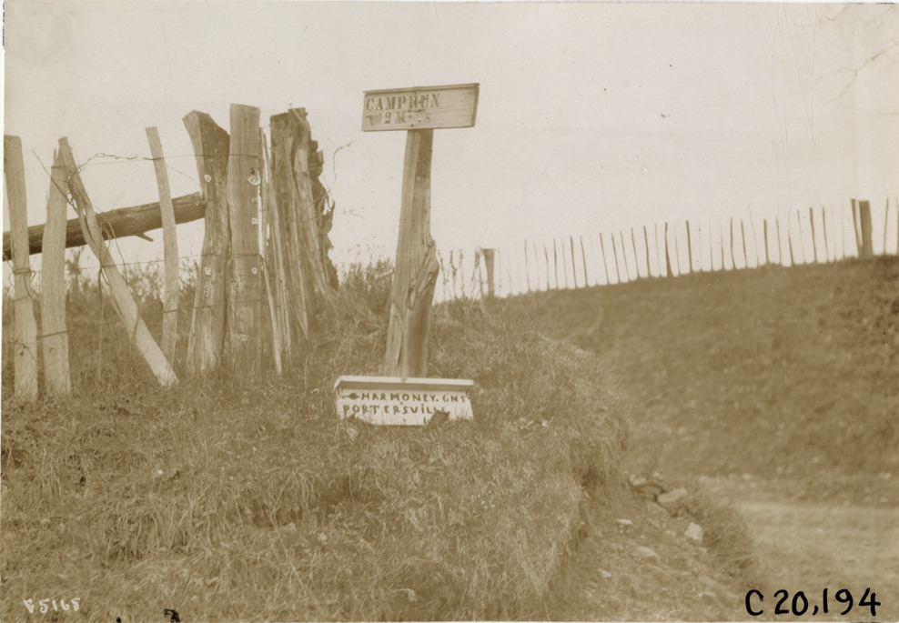 Close-up view of rustic sign on rural road indicating mileage to Camp Run, Harmony and Portersville, Pennsylvania during the pathfinding expedition for the 1908 Glidden Tour. Sign reads: "Camp Run, 2 M, Harmoney [sic], 6 M, Portersville." Handwritten on back: "Tours--Glidden Tour Pathfinder, 1908."