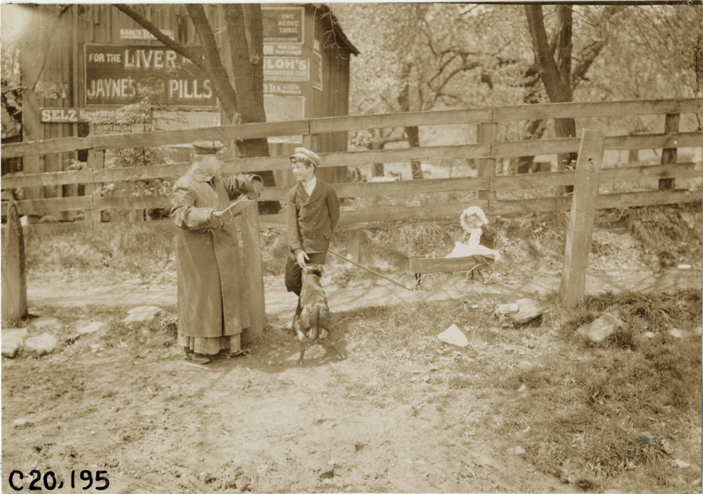 View of Dai H. Lewis speaking with boy on farm during the pathfinding expedition for the 1908 Glidden Tour. Boy pets dog; girl sits in wagon. Barn with advertisement for Jayne's liver pills in background. Handwritten on back: "Tours--Glidden Tour Pathfinder, 1908."