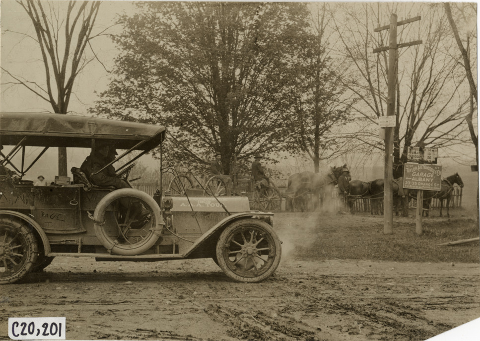 View of motorists in Premier car looking at horse-drawn wagon in New York during the pathfinding expedition for the 1908 Glidden Tour. Sign advertising the Taylor Automobile Co. Garage in Albany, New York in background. Stamped on back: "Photo by N. Lazarnick, 29 West 42nd Street, N.Y., tel. 594 Bryant." Handwritten on back: "6 cyl. & 6 horse team. Tours--Glidden Tour Pathfinder, 1908."