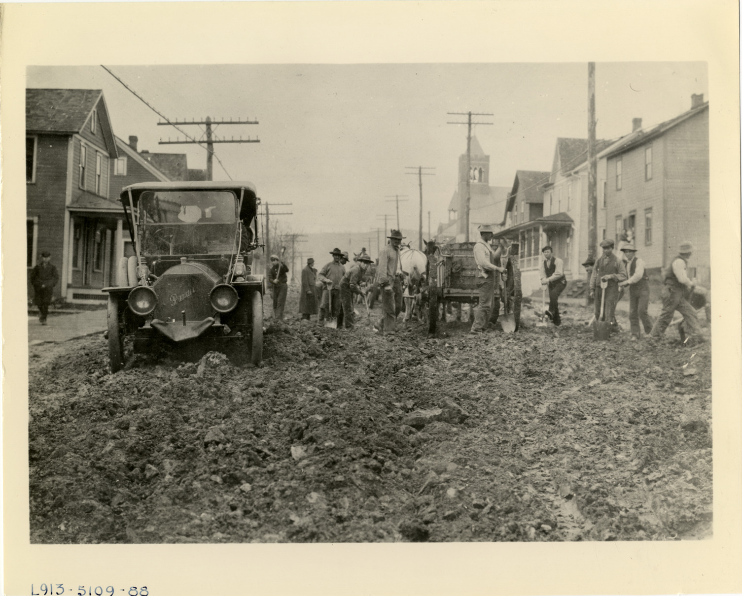 View of motorists in Premier car on uneven dirt road during the pathfinding expedition for the 1908 Glidden Tour. Group of men with shovels surround horse-drawn wagon in road. Houses and church line street. Handwritten on back: "Premier. Tours--Glidden Tour Pathfinder, 1908."