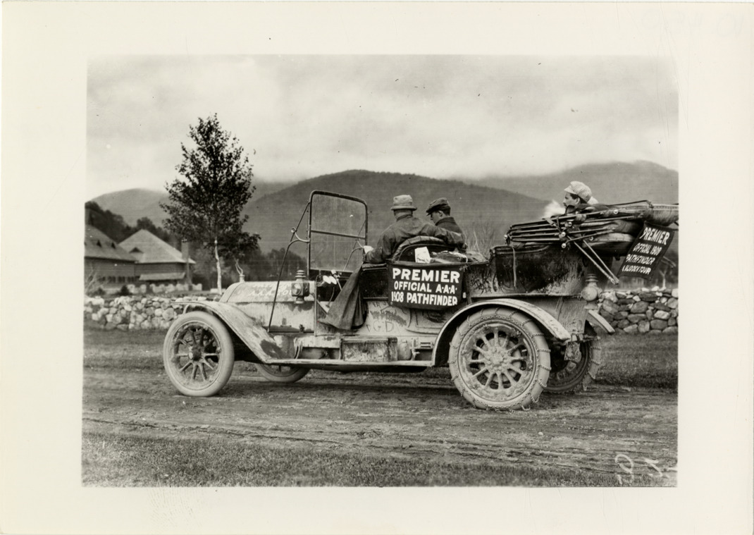 Motorists in Premier automobile traveling on rural road, 1908 Glidden pathfinding expedition