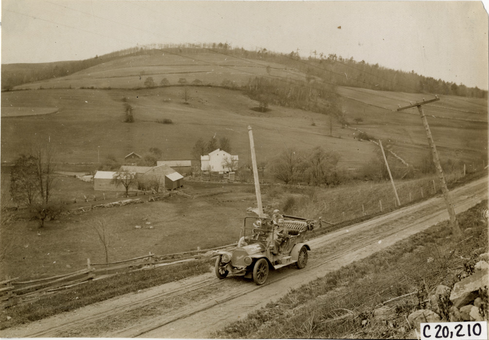 View of motorists in Premier car traveling on rural dirt road past farm buildings during the pathfinding expedition for the 1908 Glidden Tour. Stamped on back: "Photo by N. Lazarnick, 29 West 42nd Street, N.Y., tel. 594 Bryant." Handwritten on back: "Tours--Glidden Tour Pathfinder, 1908."