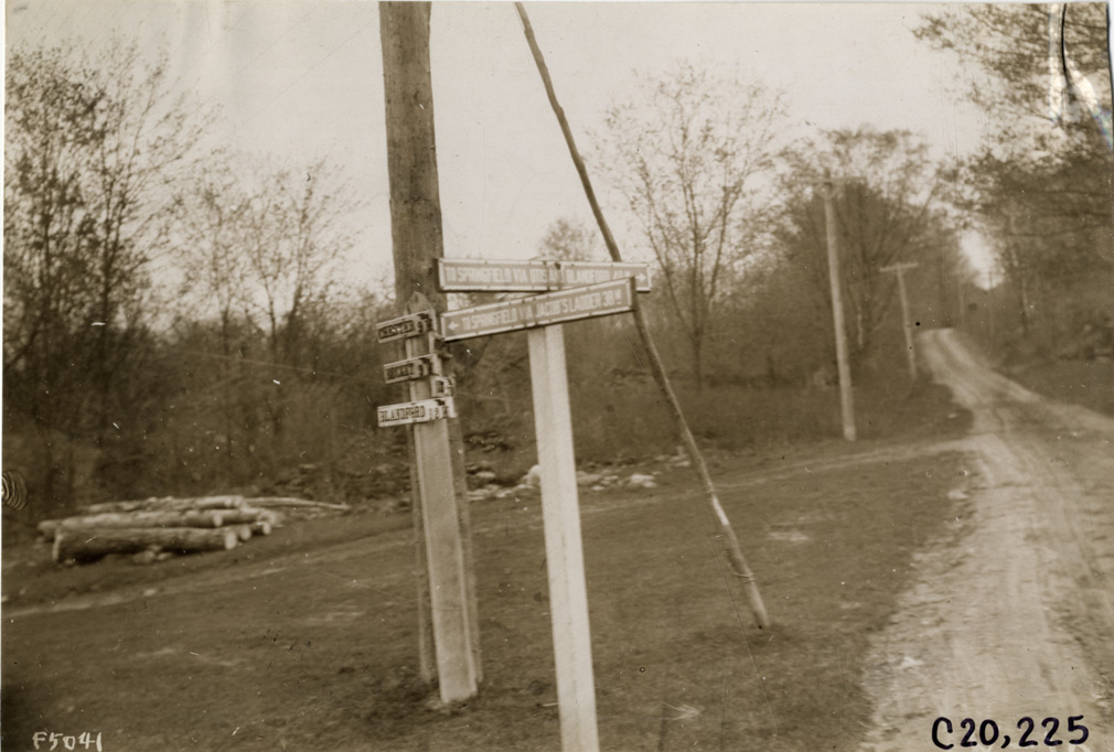Signs on rural road, Massachusetts, 1908 Glidden pathfinding expedition