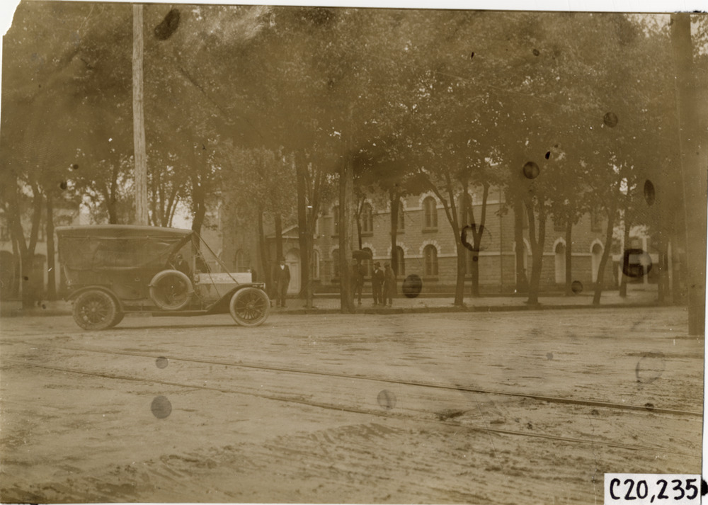 Motorists in Premier automobile passing church, 1908 Glidden pathfinding expedition