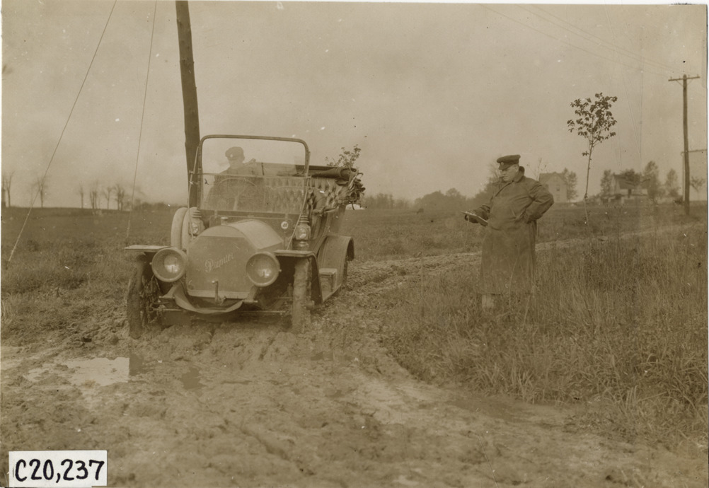 View of Dai Lewis and motorist with Premier car on muddy rural road during the pathfinding expedition for the 1908 Glidden Tour. Handwritten on back: "Tours--Glidden Tour Pathfinder, 1908."