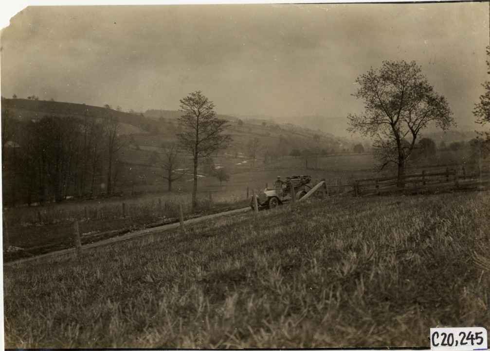 Motorists in Premier automobile traveling on rural road, 1908 Glidden pathfinding expedition