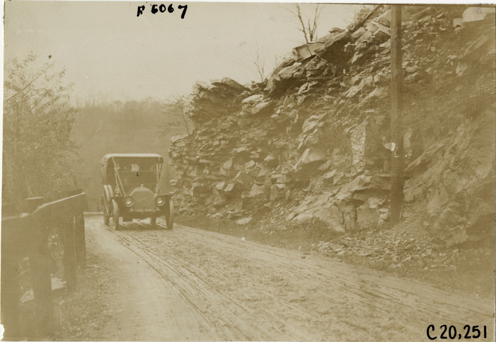 Motorists in Premier automobile traveling on mountain road, 1908 Glidden pathfinding expedition