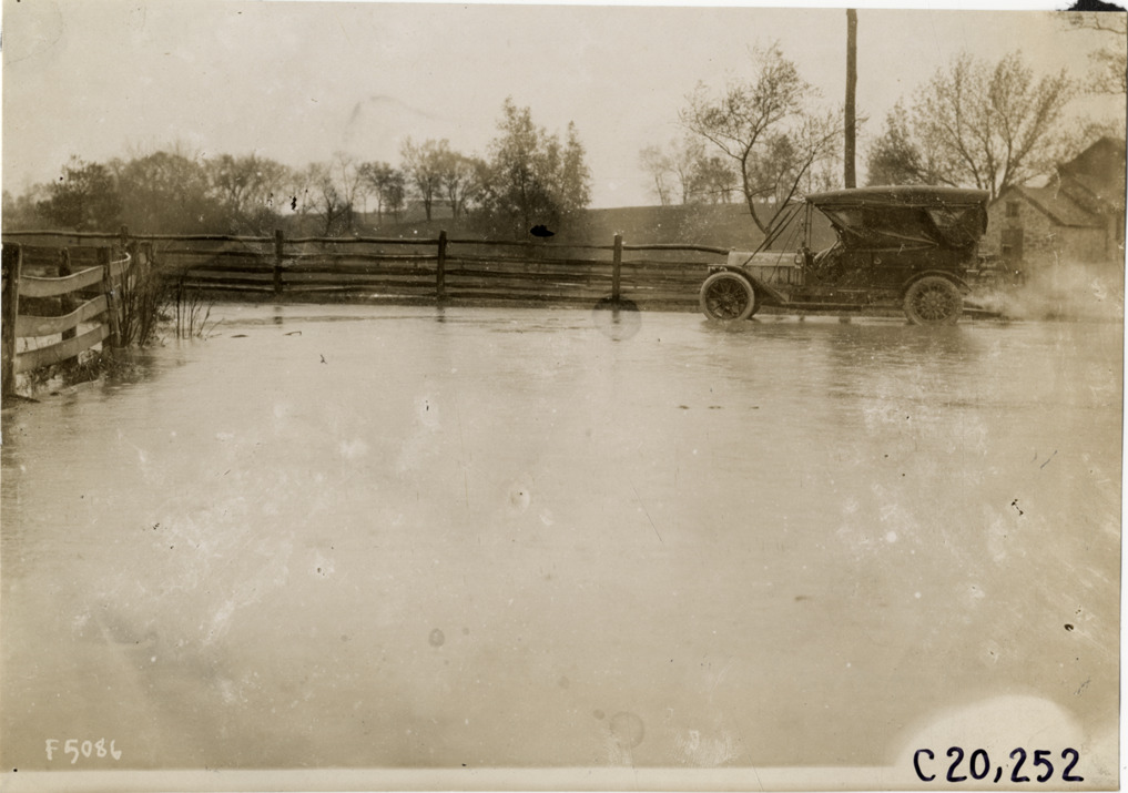 View of motorists in Premier car traveling on flooded stretch of road during the pathfinding expedition for the 1908 Glidden Tour. Handwritten on back: "Tours--Glidden Tour Pathfinder, 1908."