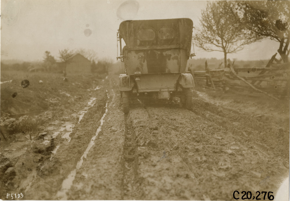 Rear view of Premier car traveling on muddy rural road during the pathfinding expedition for the 1908 Glidden Tour. Handwritten on back: "Tours--Glidden Tour Pathfinder, 1908."