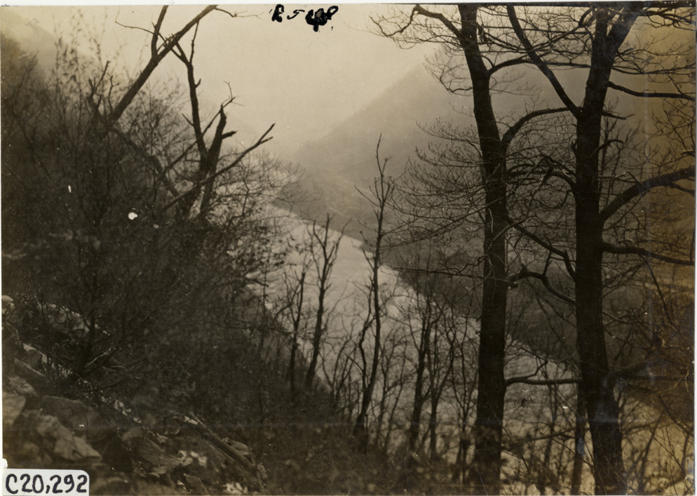 View of Delaware Water Gap during the pathfinding expedition for the 1908 Glidden Tour. Stamped on back: "Photo by N. Lazarnick, 29 West 42nd Street, N.Y., tel. 594 Bryant." Handwritten on back: "Tours--Glidden Tour Pathfinder, 1908."