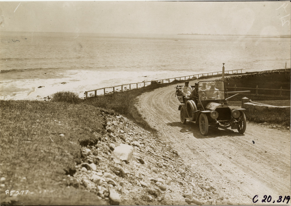 Motorists in Premier automobile traveling on road near shoreline, 1908 Glidden pathfinding expedition