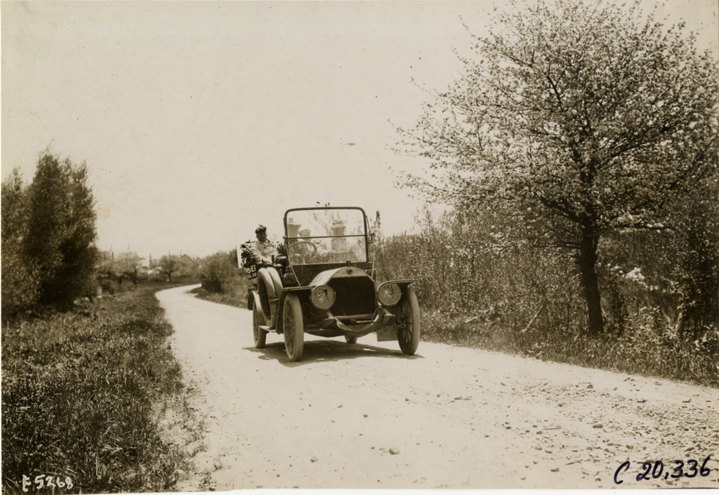 Motorists in Premier automobile traveling on rural road, 1908 Glidden pathfinding expedition