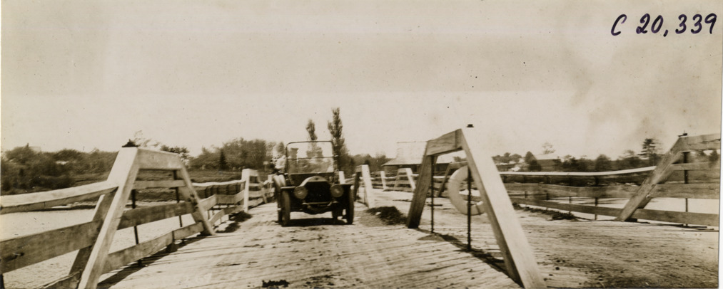 View of motorists in Premier car crossing wooden bridge during the pathfinding expedition for the 1908 Glidden Tour. Handwritten on back: "Tours--Glidden Tour Pathfinder, 1908."