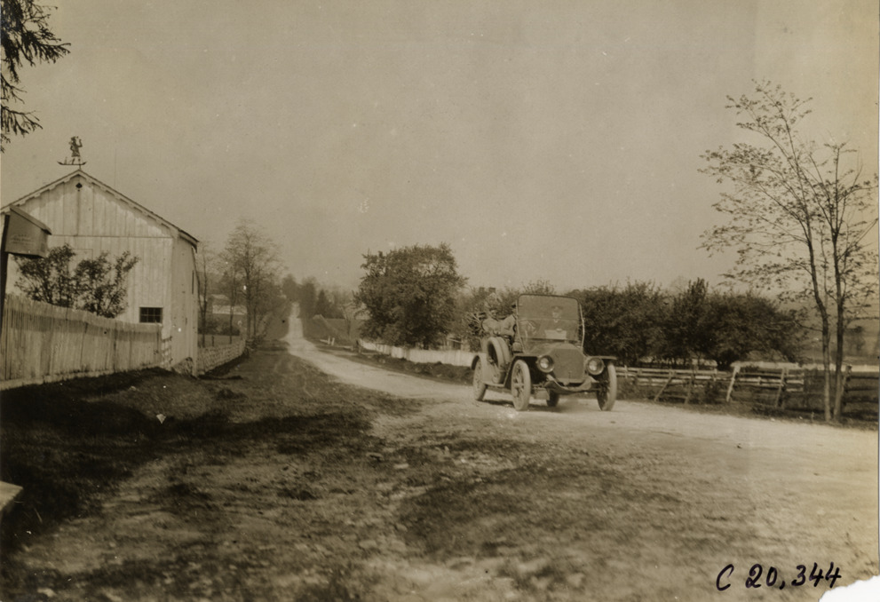 View of motorists in Premier car traveling on rural dirt road during the pathfinding expedition for the 1908 Glidden Tour. Barn with weathervane on left. Handwritten on back: "Tours--Glidden Tour Pathfinder, 1908."