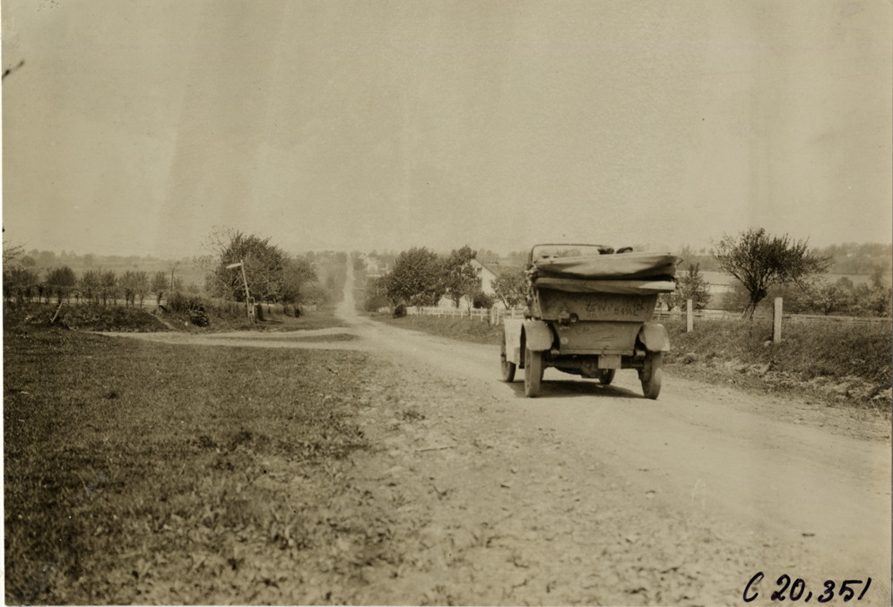 Rear view of motorists in Premier car traveling on rural dirt road near Unionville, Pennsylvania during the pathfinding expedition for the 1908 Glidden Tour. Stamped on back: "Photo by N. Lazarnick, 29 West 42nd Street, N.Y., tel. 594 Bryant." Handwritten on back: "Nice stretch of road near Unionville. Tours--Glidden Tour Pathfinder, 1908."