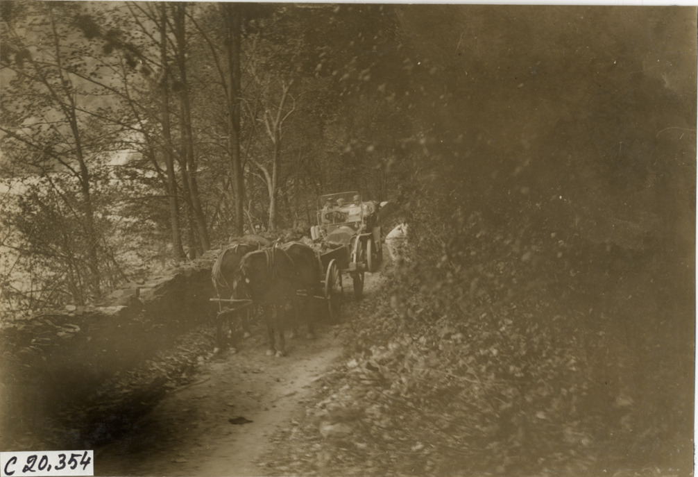 View of motorists in Premier car following horse-drawn wagon on narrow road near Kittatinny Hotel at Delaware Water Gap, Pennsylvania during the pathfinding expedition for the 1908 Glidden Tour. Stamped on back: "Photo by N. Lazarnick, 29 West 42nd Street, N.Y., tel. 594 Bryant." Handwritten on back: "Narrow road near Kittatinny Hotel. Tours--Glidden Tour Pathfinder, 1908."