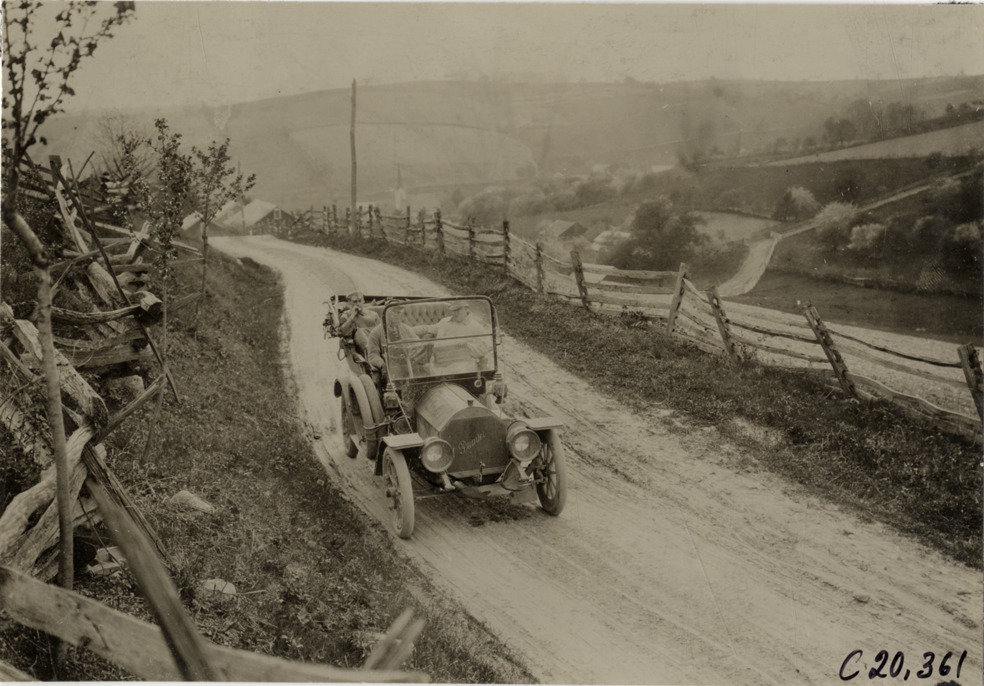 View of motorists in Premier car traveling on rural dirt road during the pathfinding expedition for the 1908 Glidden Tour. Stamped on back: "Photo by N. Lazarnick, 29 West 42nd Street, N.Y., tel. 594 Bryant." Handwritten on back: "Going up steep hill. Tours--Glidden Tour Pathfinder, 1908."